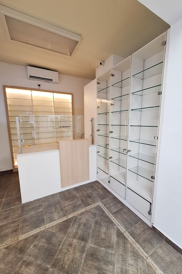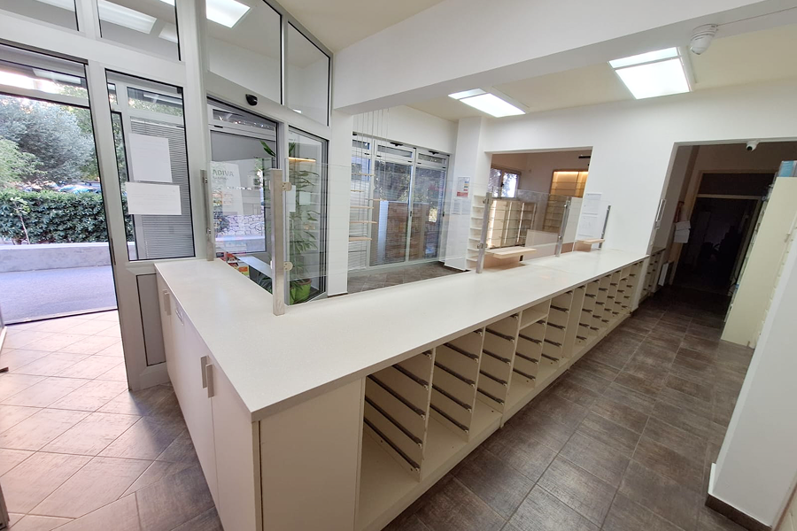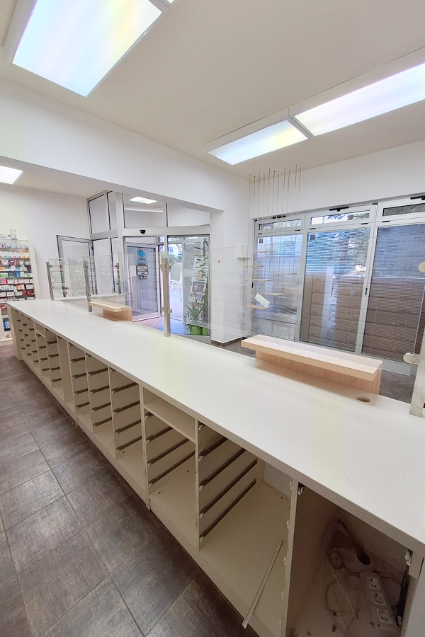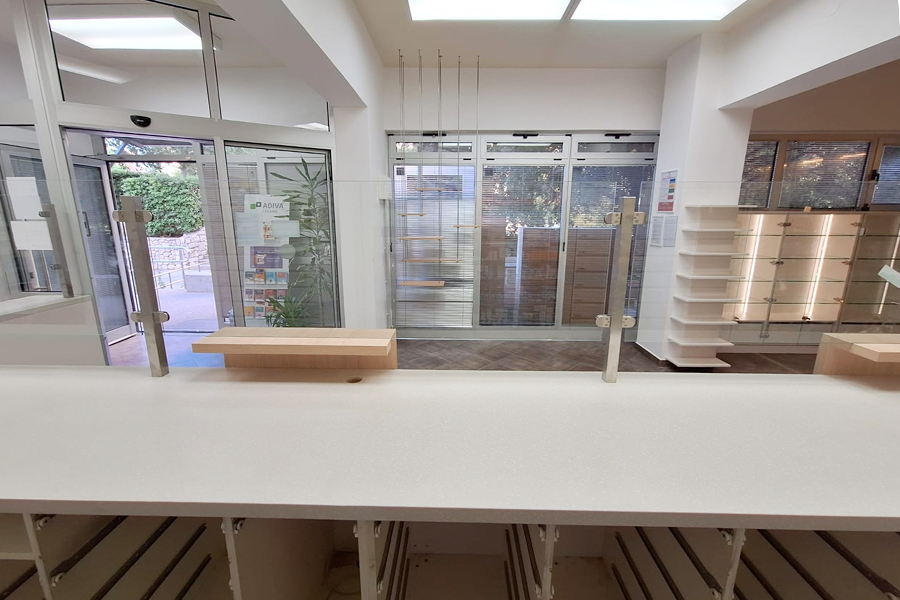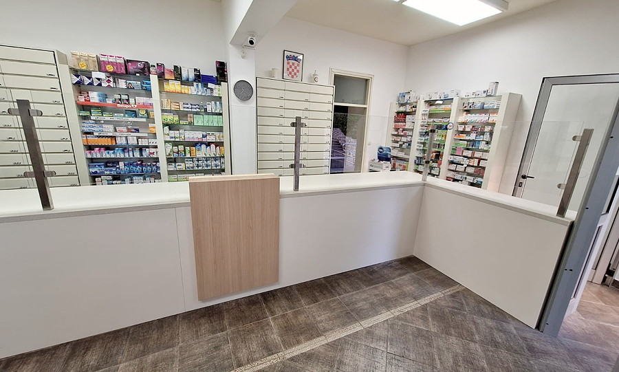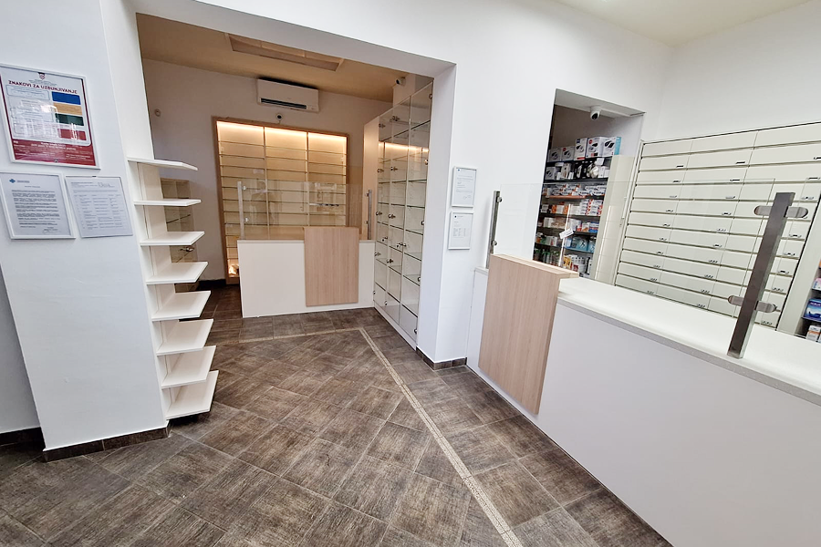 Postojeći recepturni pultevi obloženi su novim svijetlim dekorima iverala uz drvene na mjestima izdavanja lijekova. Nova staklena nadogradnja omogućuje bolju zdravstvenu zaštitu farmaceutkinja u vrijeme influence.