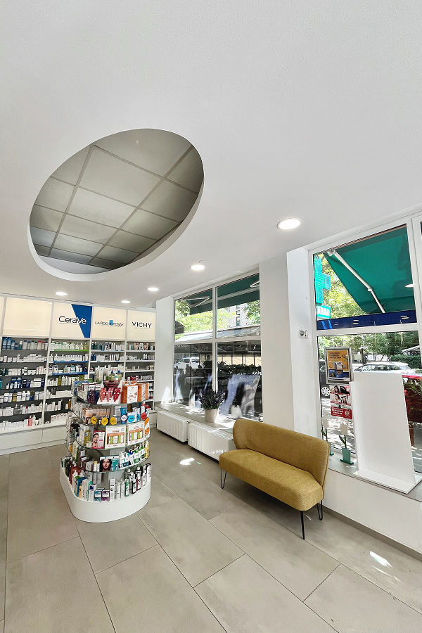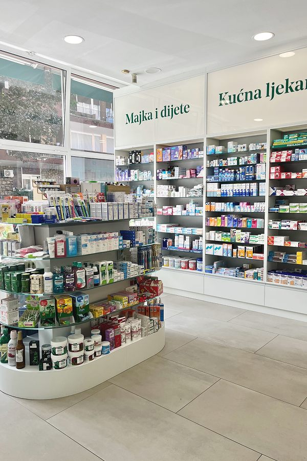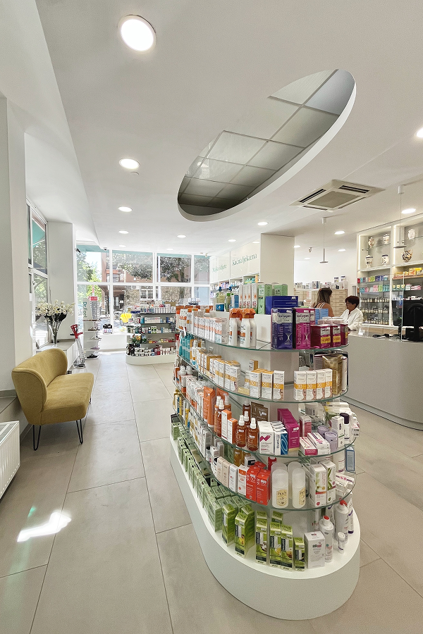 U svima dragoj ulici, Martićevoj, dobili smo zadatak redizajniranja i proizvodnje interijera postojeće ljekarne. Uspjeli smo ispuniti zahtjev investitora da prostor bude ugodan, moderan i funkcionalan skladnom kombinacijom Premium bijelog drvenog dekora i sistemsko osmišljenog osvjetljenja. Ljekarnom dominiraju recepturni pult izveden u kerrocku bez vidljivih spojeva, kutni retropult i gondole s policama.?